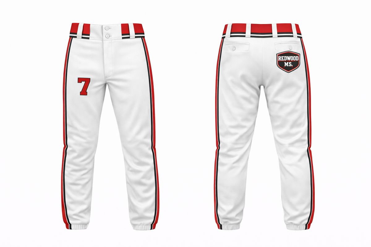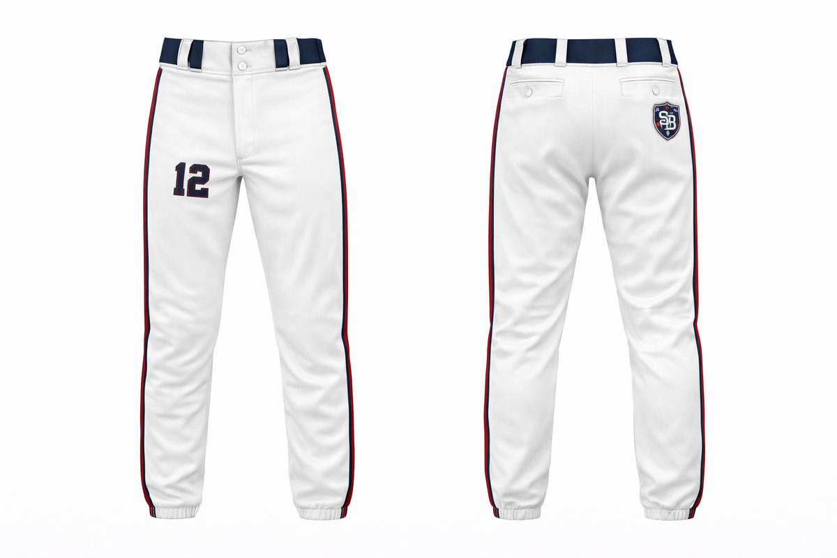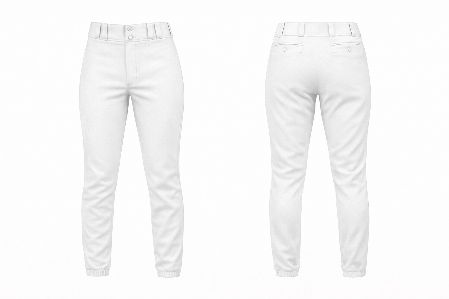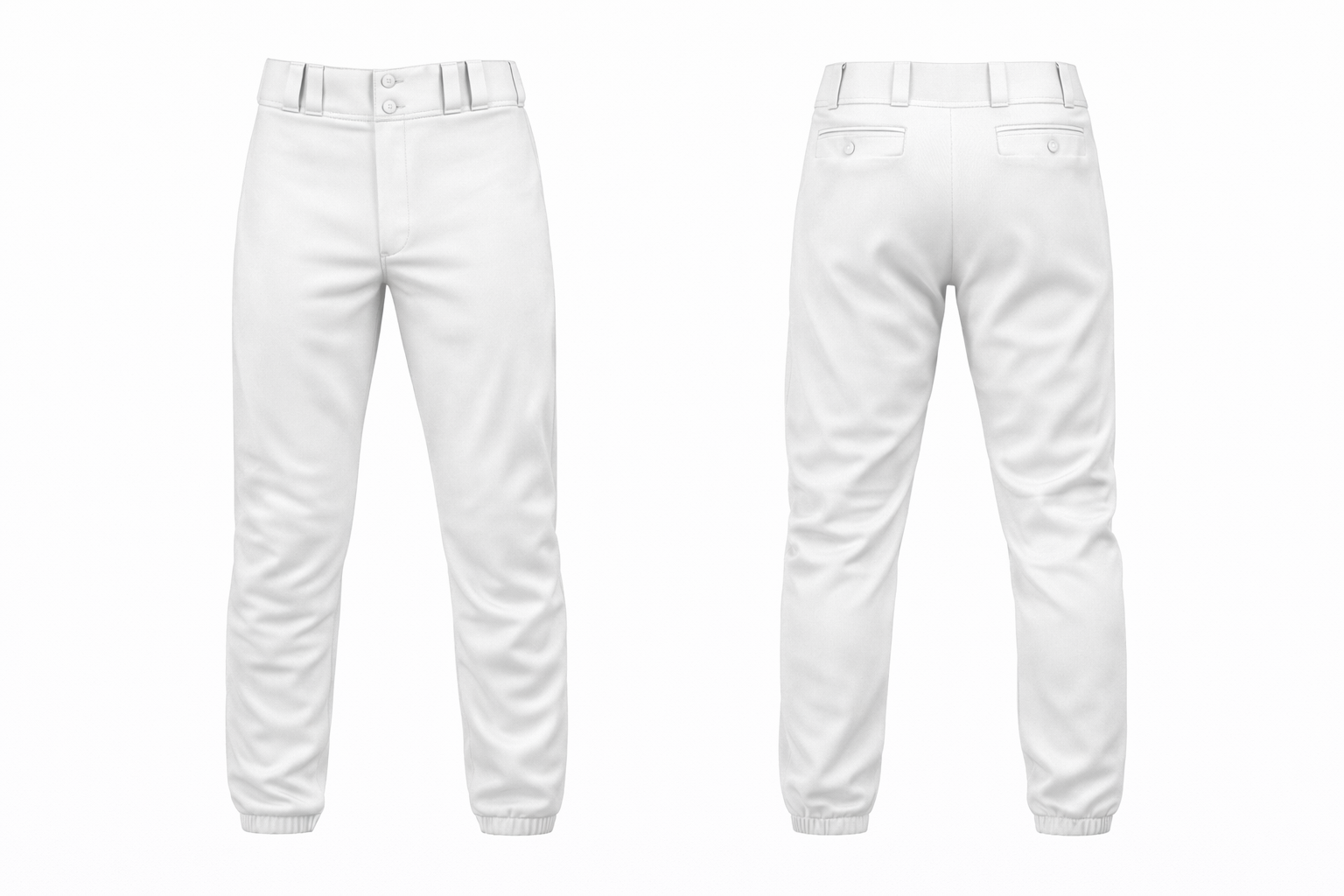 Classic, unbranded baseball pants shown in both front and back views—perfect for custom team uniforms. Designed with a traditional fit, belt loops, reinforced seams, and clean panels ready for your team’s colors, logos, and numbers.