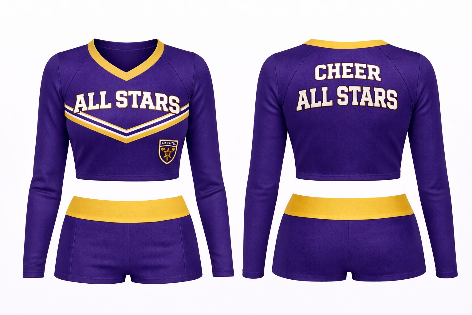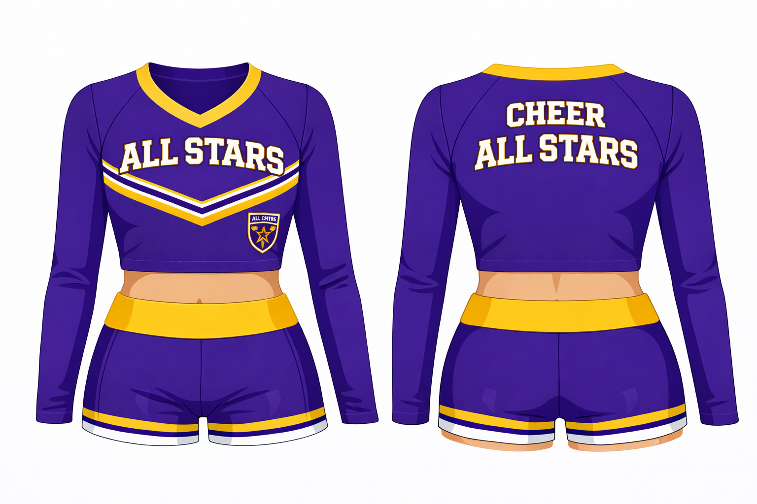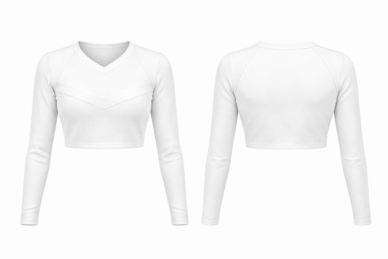 A long-sleeve cheer crop top pattern that hits above the waist—commonly used by high-level allstar and competitive college teams. Front and back views included, with clean panels designed for custom colors, logos, rhinestones, and lettering.
