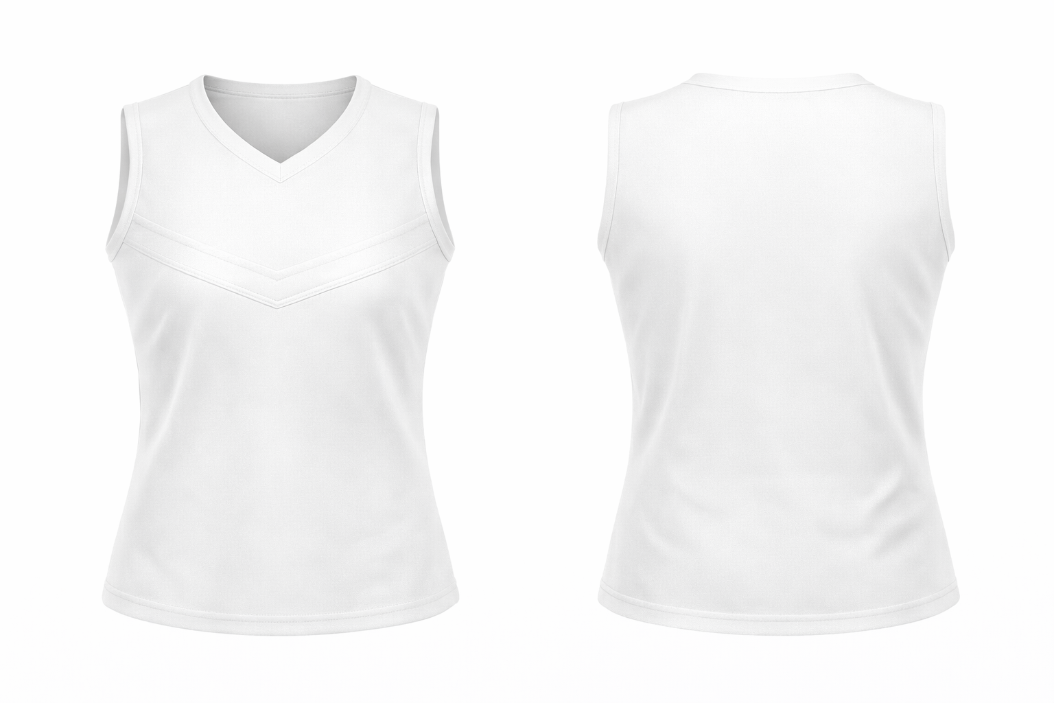 A classic sleeveless cheer shell pattern with a clean V-neck and streamlined panel lines. Shown in front and back views, this template is ideal for custom team designs—ready for logos, lettering, and color blocking. Available in full-length and cropped options.