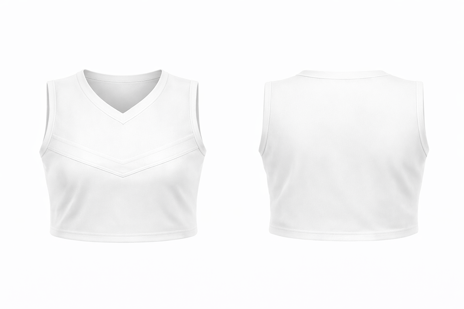 A sleeveless cheer crop top pattern that hits above the waist—popular for college and allstar teams. Front and back views included, with clean panel lines for easy customization with team colors, logos, and lettering.